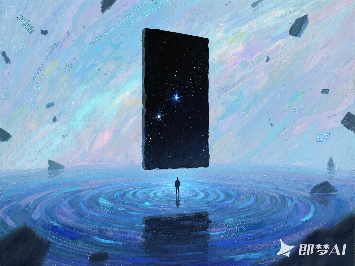 夜色如墨,我跪于荒漠。干裂黄土在月光下泛着银灰微光,两倍于我身高的黑石板似未来之门在我面前升起。它通体黝黑,纹理交织,似牵引着未知星河。石板四周的风声骤停,只剩下我的呼吸和轻微的心跳回声。我犹豫着贴掌于石面,微电流瞬间自指尖涌入心底。
